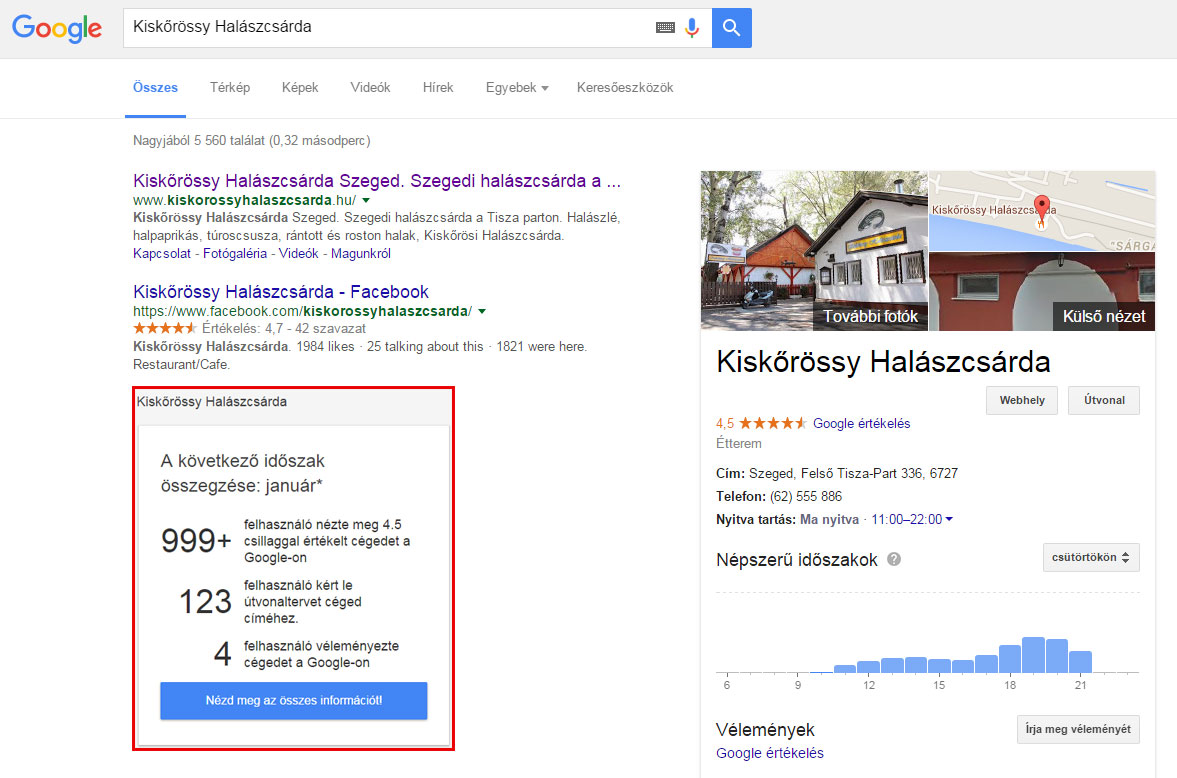 Ami még ennél is izgalmasabb és fontosabb, hogy 123-an útvonal tervet és kértek a csárdához. Joggal feltételezzük, hogy többségük, nyilván nem egyedül valóban el is látogatott a neves Tisza parti halászcsárdába.